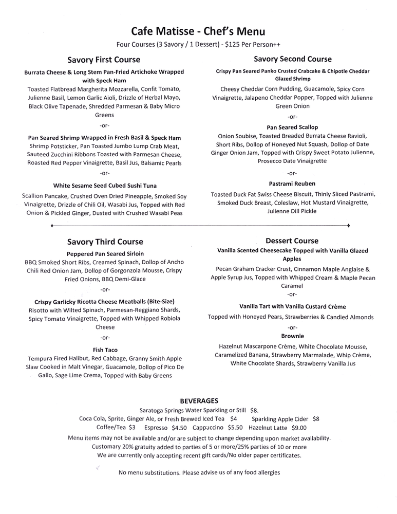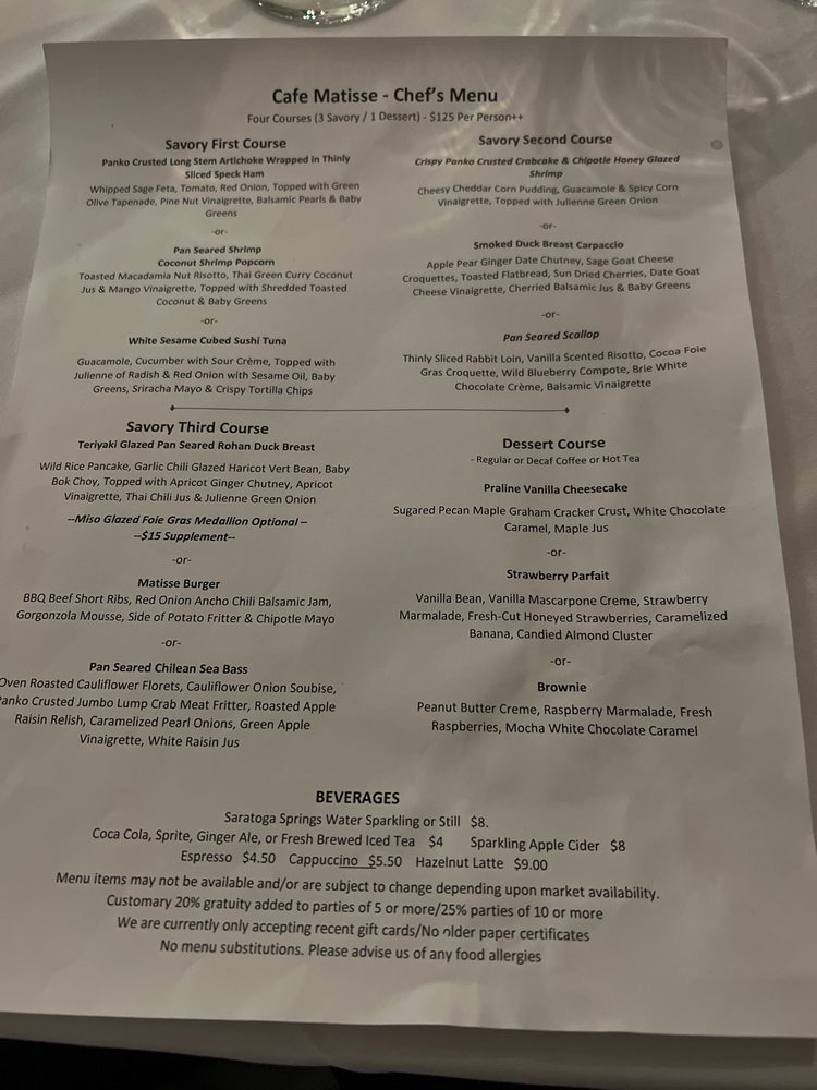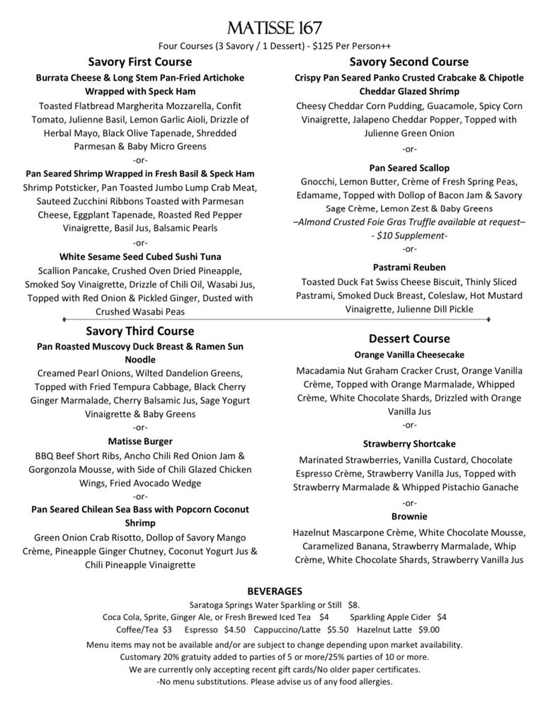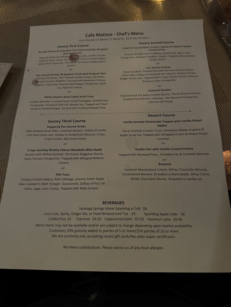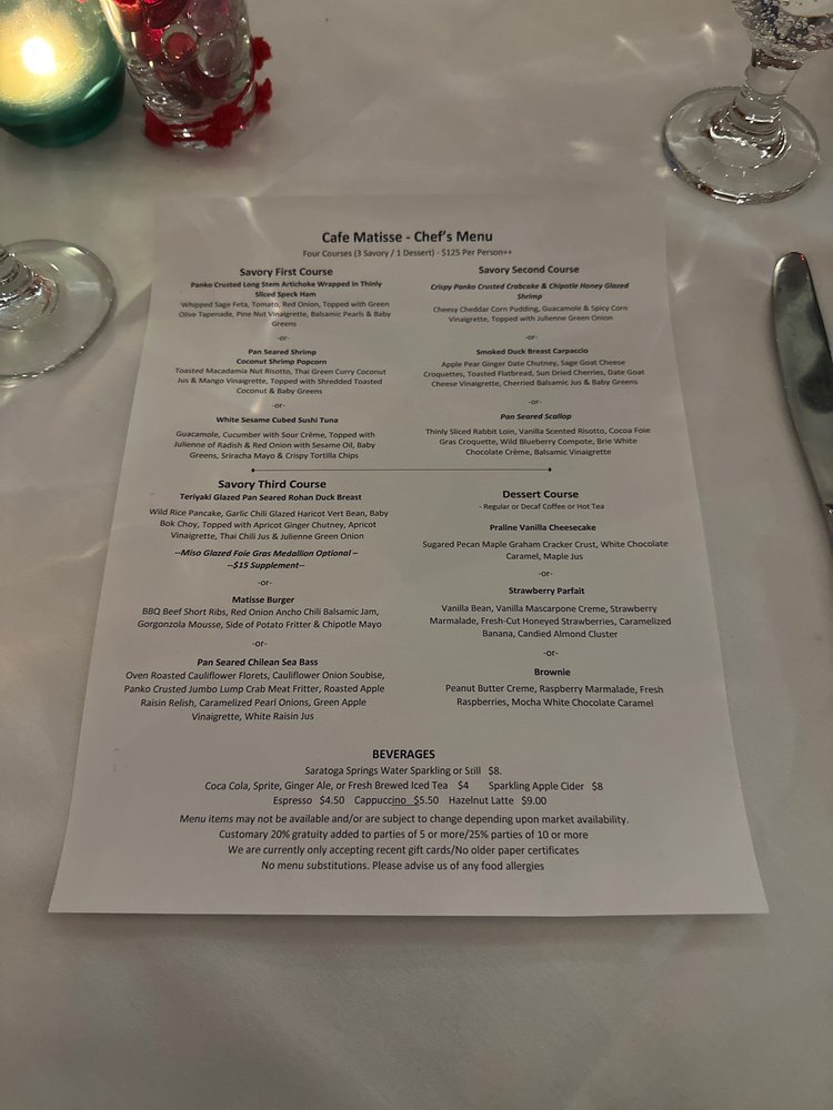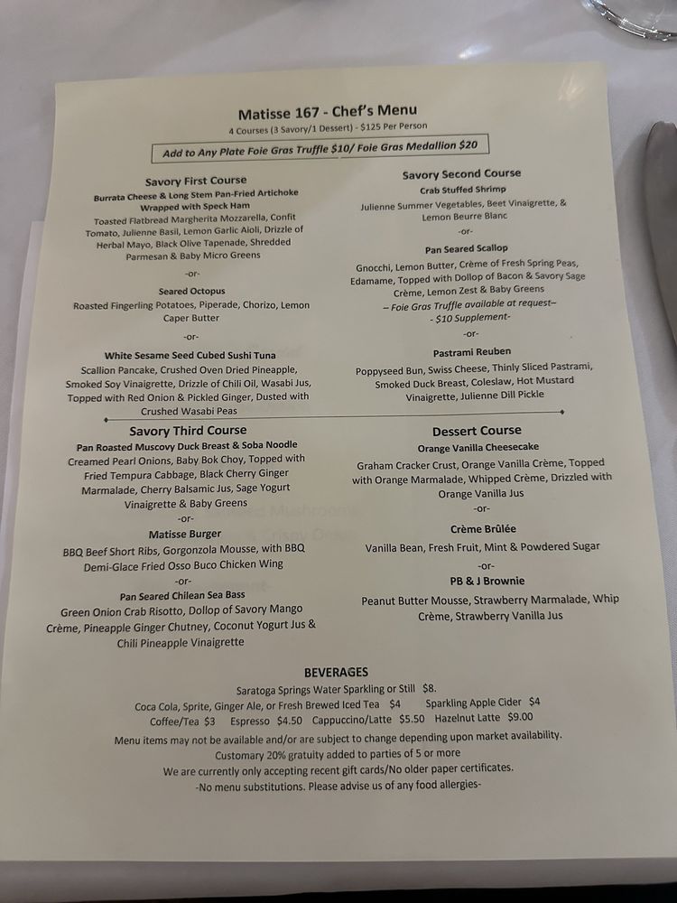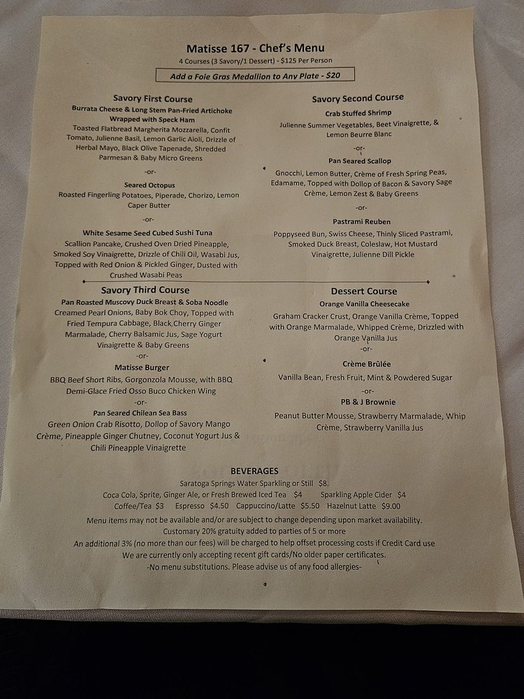 Located in a quieter section of Park Ave in Rutherford, Matisse 167 offers a French - New American dining experience with a touch of romance and elegance. The intimate setting is perfect for special occasions, with an outdoor garden area adding to the charm. Customers rave about the delicious 4-course prix fixe menu that changes seasonally, offering generous portions and impressive flavors. Receiving high praise for attentive service and impeccable timing, Chef Greg's creations have impressed both longtime patrons and new visitors alike. With a BYOB policy and a menu that caters to various dietary preferences, Matisse 167 is a must-visit for those looking for a memorable dining experience.