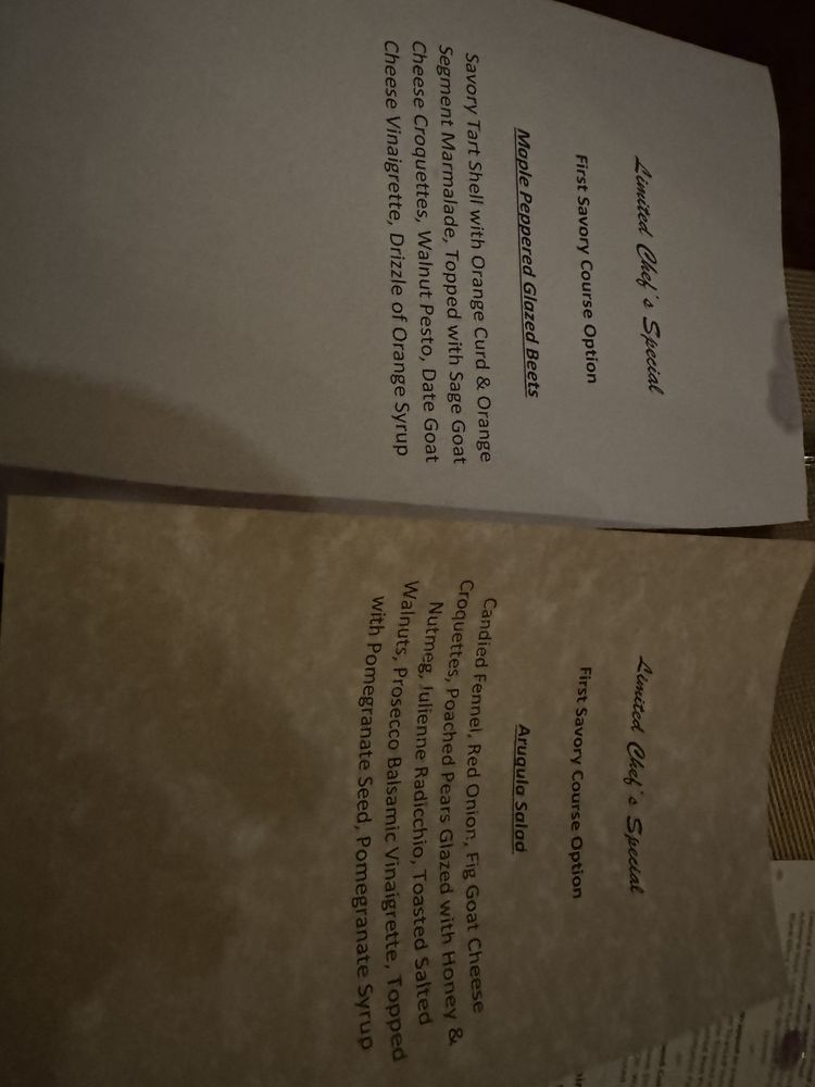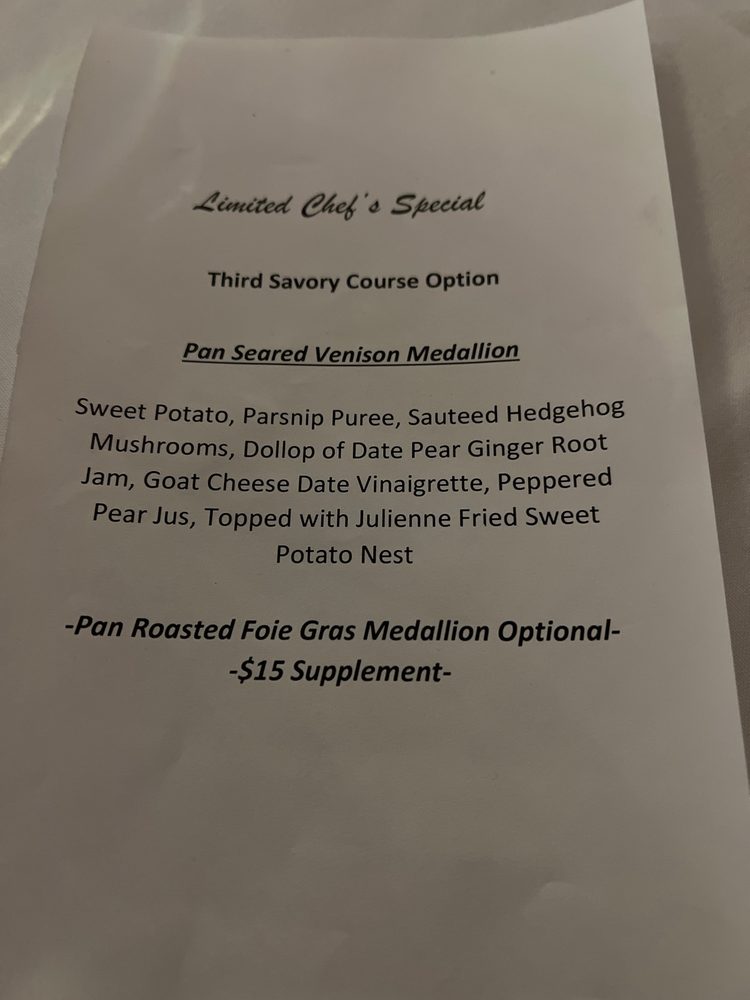 Sweet Potato Parsnip Puree, Sauteed Hedgehog Mushrooms, Dollop of Date Pear Ginger Root Jam, Goat Cheese Date Vinaigrette, Peppered Pear Jus, Topped with Julienne Fried Sweet Potatoes